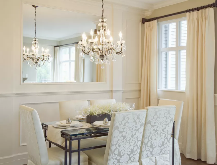Зеркало в столовой особенно хорошо сочетается с люстрой; зеркало будет отражать свет и сделает комнату более просторной и формальной. (Изображение через fuernte.com)