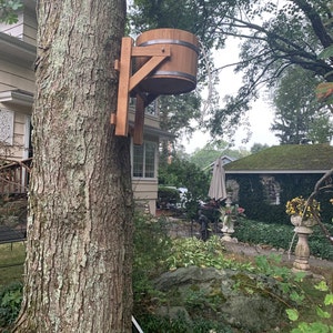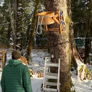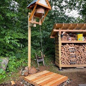 Обновление 2 – установлено на столбе рядом с нашей дровяной бочкообразной сауной. Я добавил крышу, чтобы она не собиралась дождевой водой, снегом или листьями, и собирала брызговик для просачивания стока воды. Мы использовали его в первый раз, и наш опыт работы в сауне вышел на совершенно новый уровень. Оливер/Олег делает отличную работу!