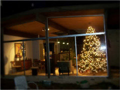 Это рождественская картинка, но она как бы показывает, что мы сделали с нашей единственной белой стеной. Большой репродукционный постер и две картины, нарисованные моим пасынком. Когда рождественской елки нет, в углу стоит музыкальный автомат, а зеленые стулья образуют зону отдыха перед музыкальным автоматом. На самом деле дедушкины часы переместились через весь дом и оказались в углу, так что у нас больше нет ничего, что было бы прикреплено к стеклу.