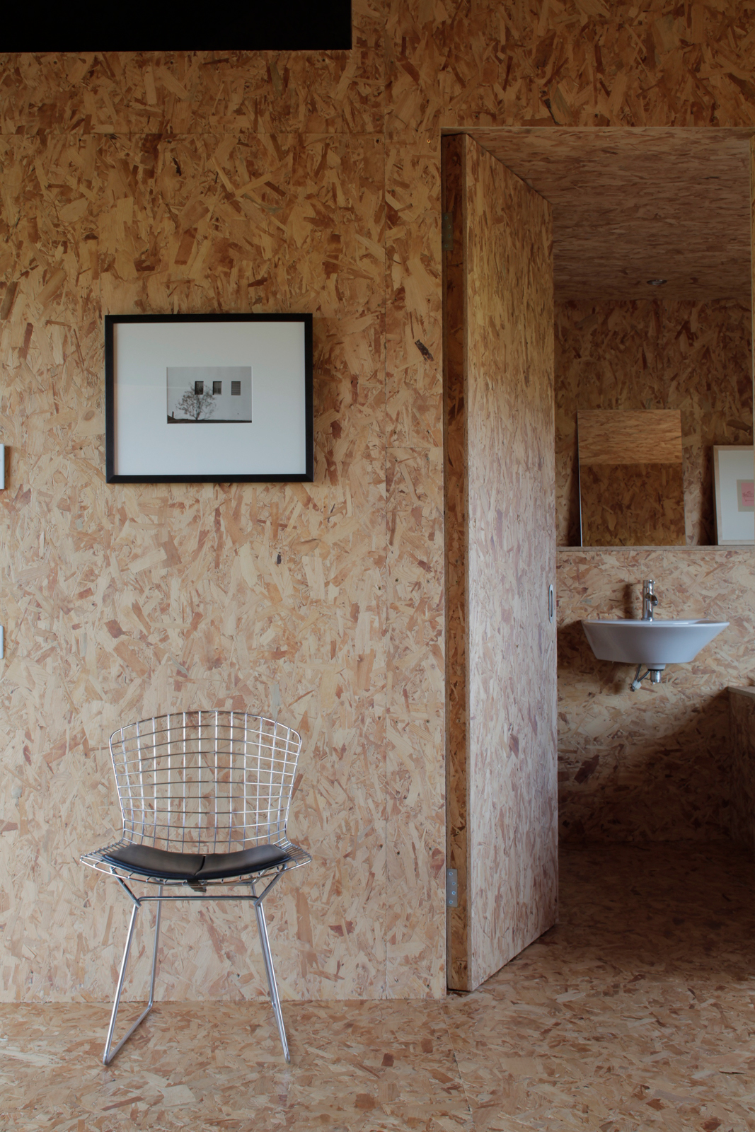 Стремясь функционировать как современный дом, построенный из простых, традиционных материалов, интерьер покрыт панелями OSB в сочетании с белыми стенами.