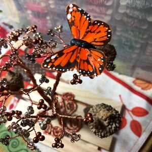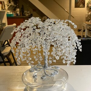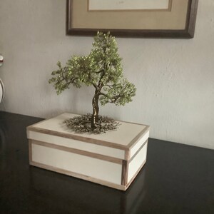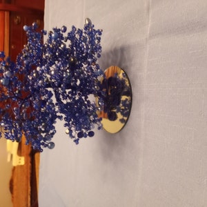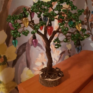 Это дерево изготовлено вручную из винтажной бронзовой проволоки и бисера. Он крепится к деревянной основе. Он станет отличным дополнением к вашему домашнему декору или подарком для того особенного человека, который любит природу.