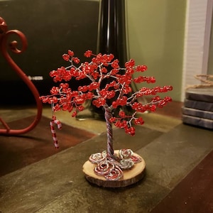 Это дерево из красной проволоки имеет высоту около 8 дюймов. На красной проволоке красные бусины, белые акцентные бусины. Он закреплен на небольшом основании из кусочков белого агата. Идеальный домашний декор для любого пространства.